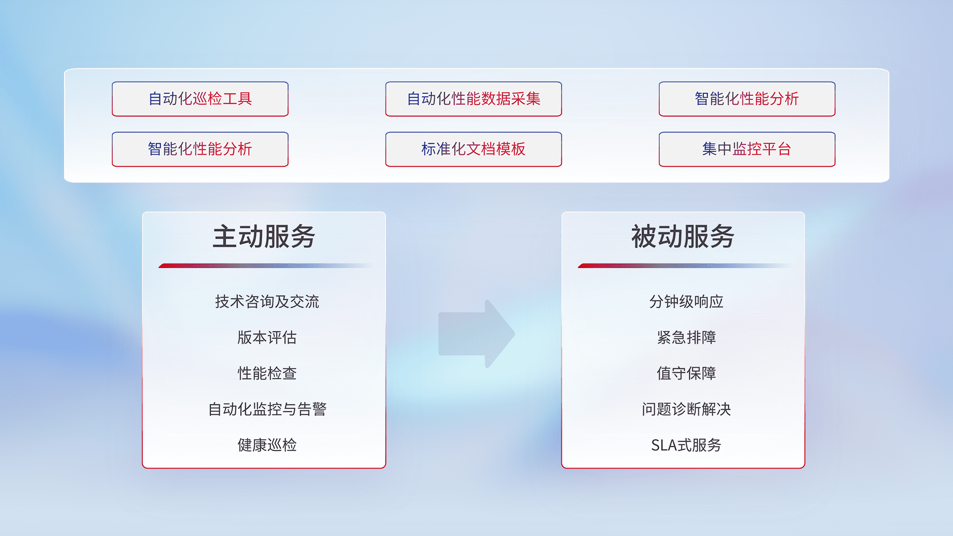 智能化工具和标准化文档,,保障服务质量,,提供主动服务(包含技术咨询、、、版本评估、、性能检查、、自动化监控与告警、、、、健康巡检)和被动服务包含(分钟级响应、、紧急排障、、值守保障、、、问题诊断解决、、、、SLA服务)。。。